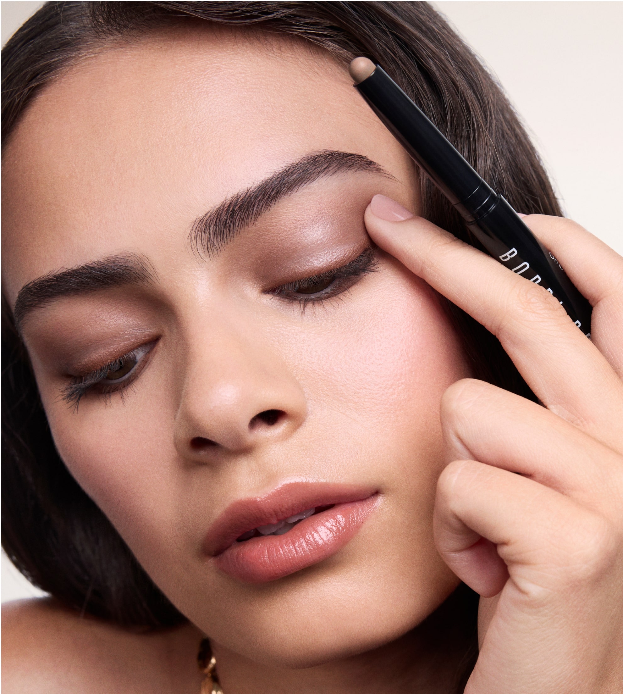 “Apply Long-Wear Cream Shadow Stick in Taupe to the lid and bottom lash line and blend out with your finger to create a soft haze.”